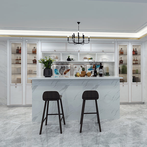 When hosting gatherings, use the island's electrically movable bar counter to create a flexible social area.