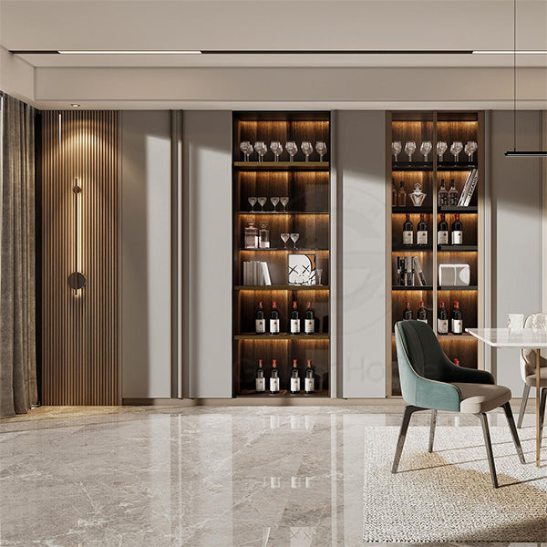 Utilizing cabinets as kitchen sliding doors, as well as wine cabinets and sideboard doors, to enhance space utilization.